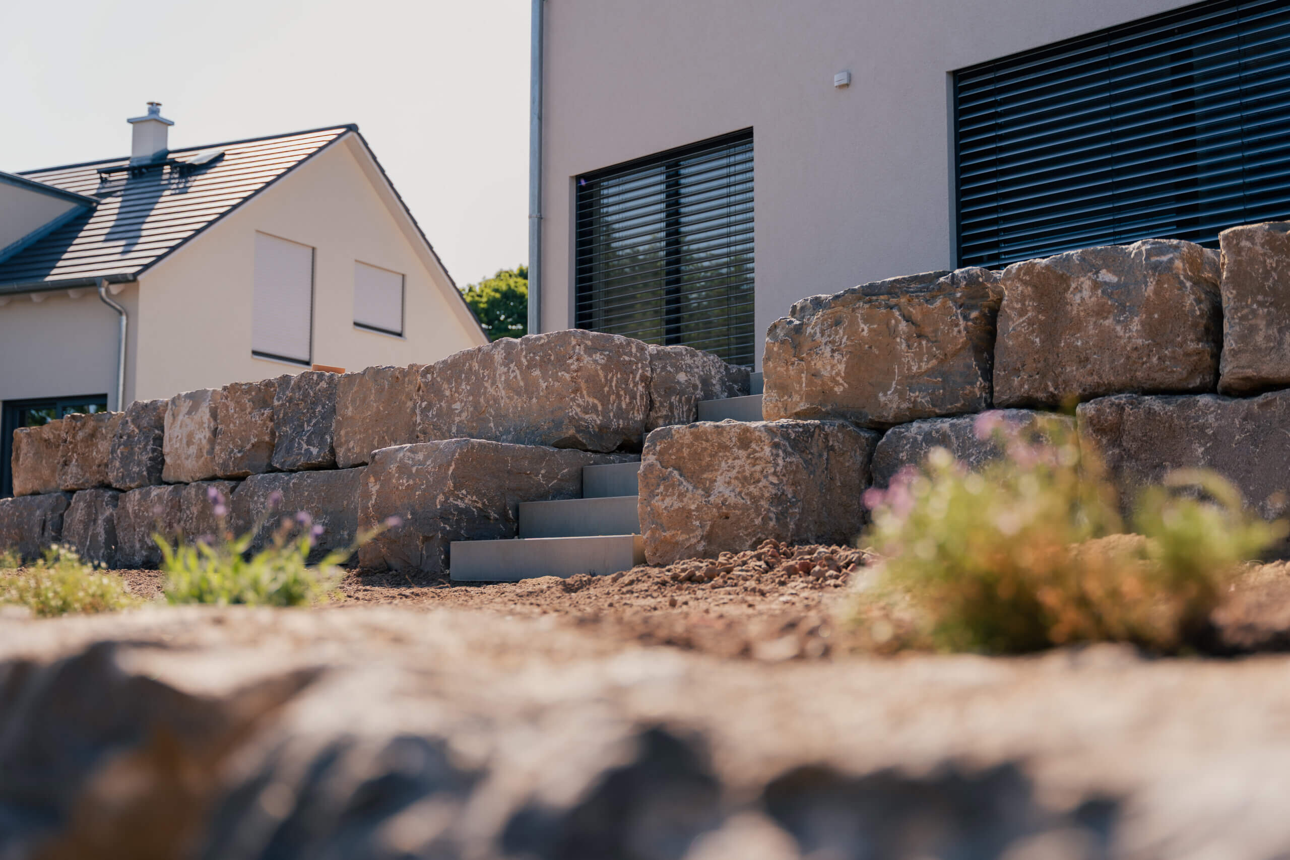 Wo das Gelände es erfordert, sorgen wir für sichere und gestalterisch ansprechende Höhenlösungen. Mit Stufenanlagen, Natursteinmauern oder Trockenmauern schaffen wir Struktur und Stabilität.