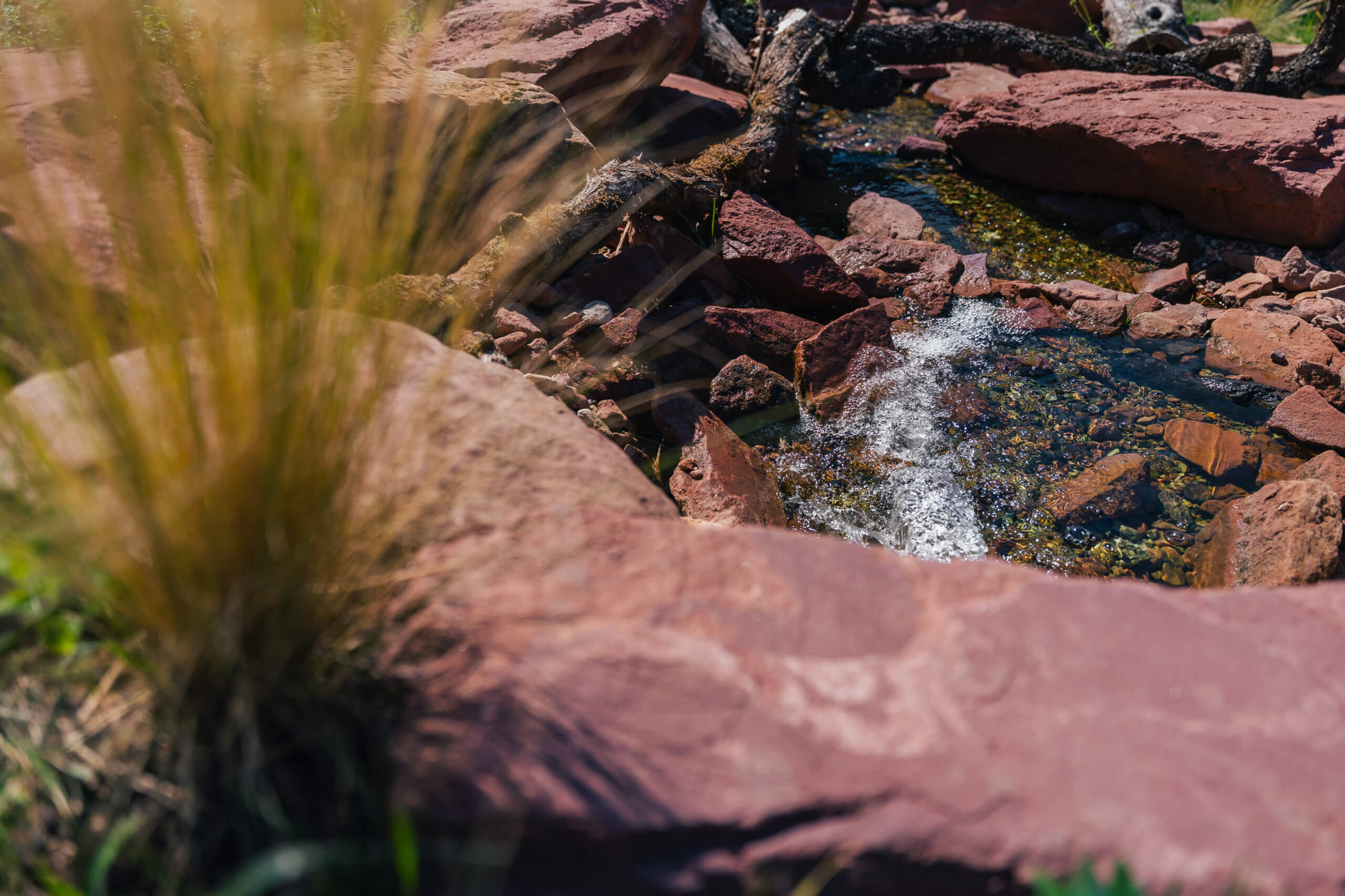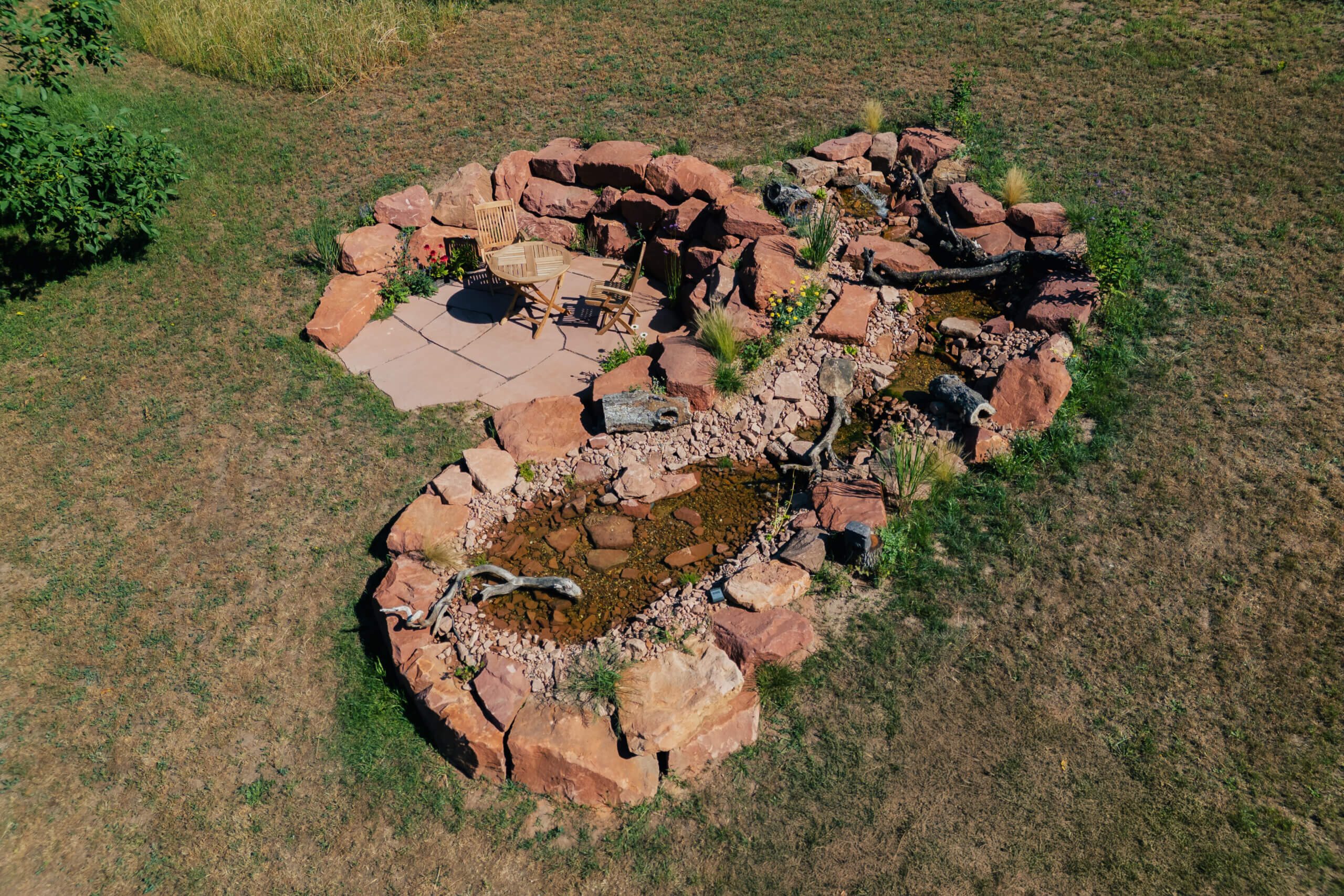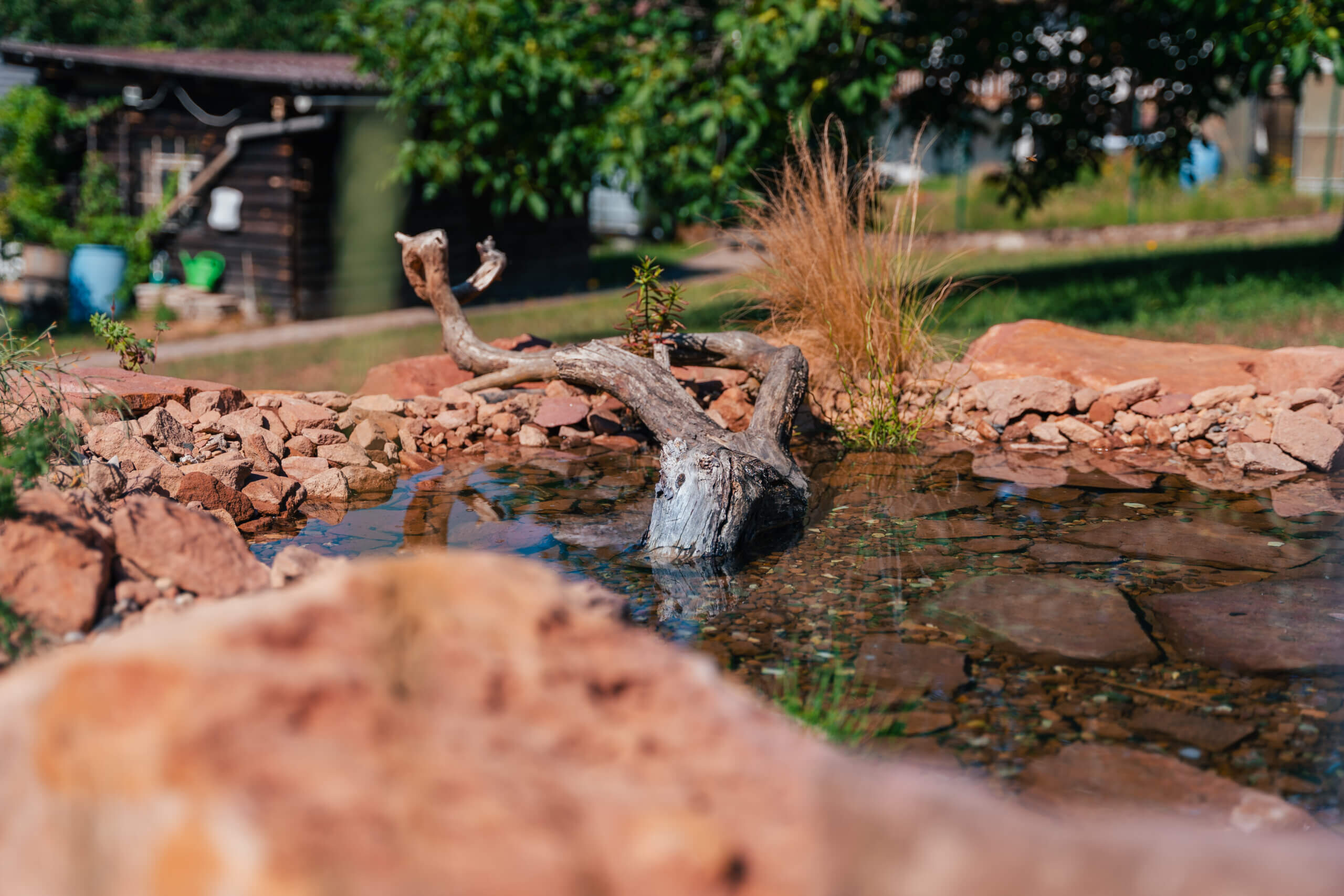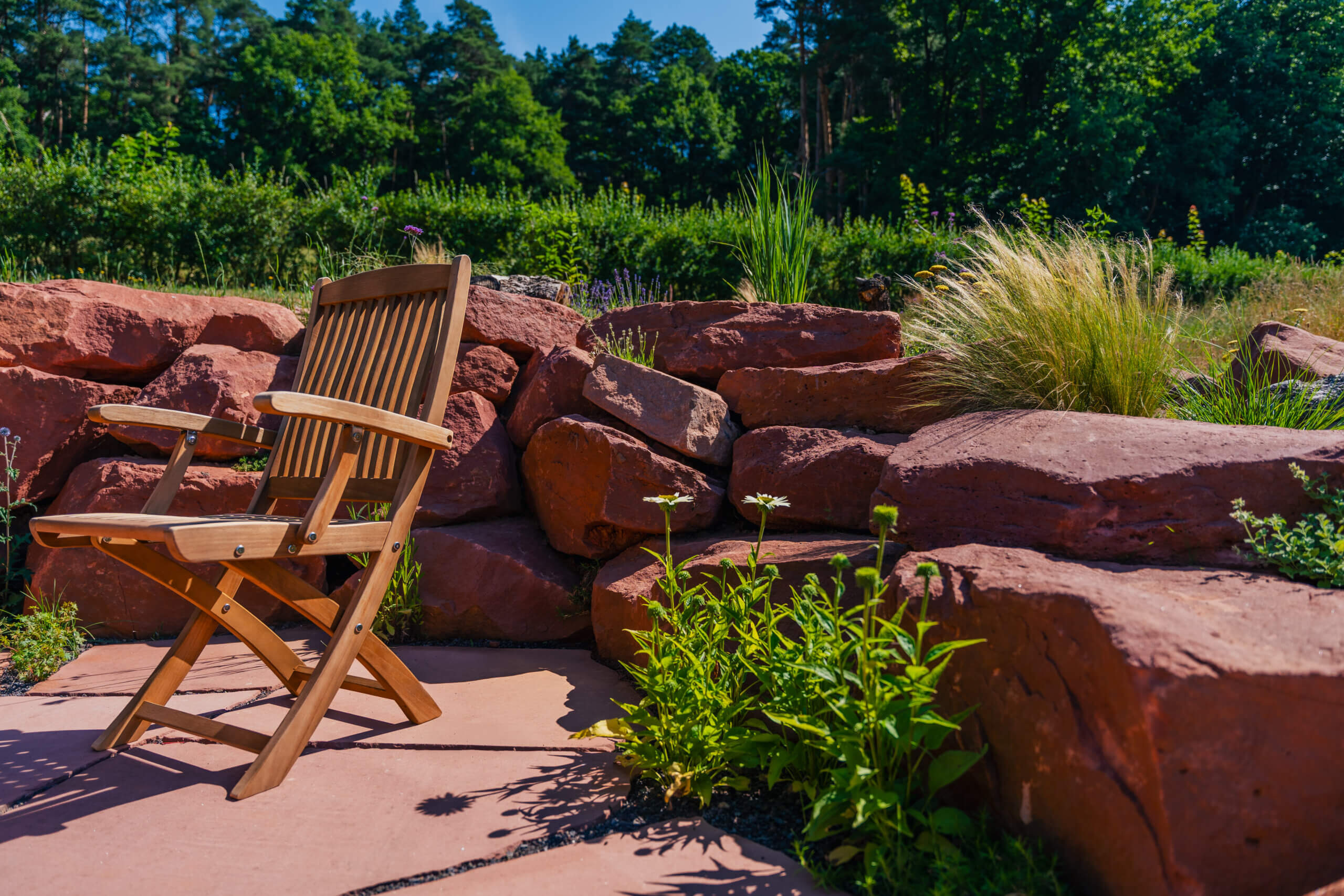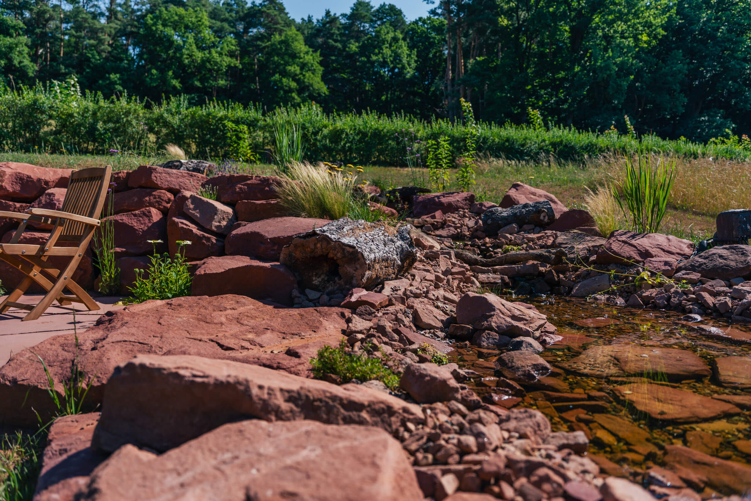 Herausforderung Bedenken wegen zu vieler Steinflächen im Garten. | Lösung Ein ausgewogenes Pflanzkonzept mit Wasserpflanzen, Sonnenhut am Sitzplatz und Gräsern auf der Mauerkrone schafft Natürlichkeit und Lebendigkeit. |