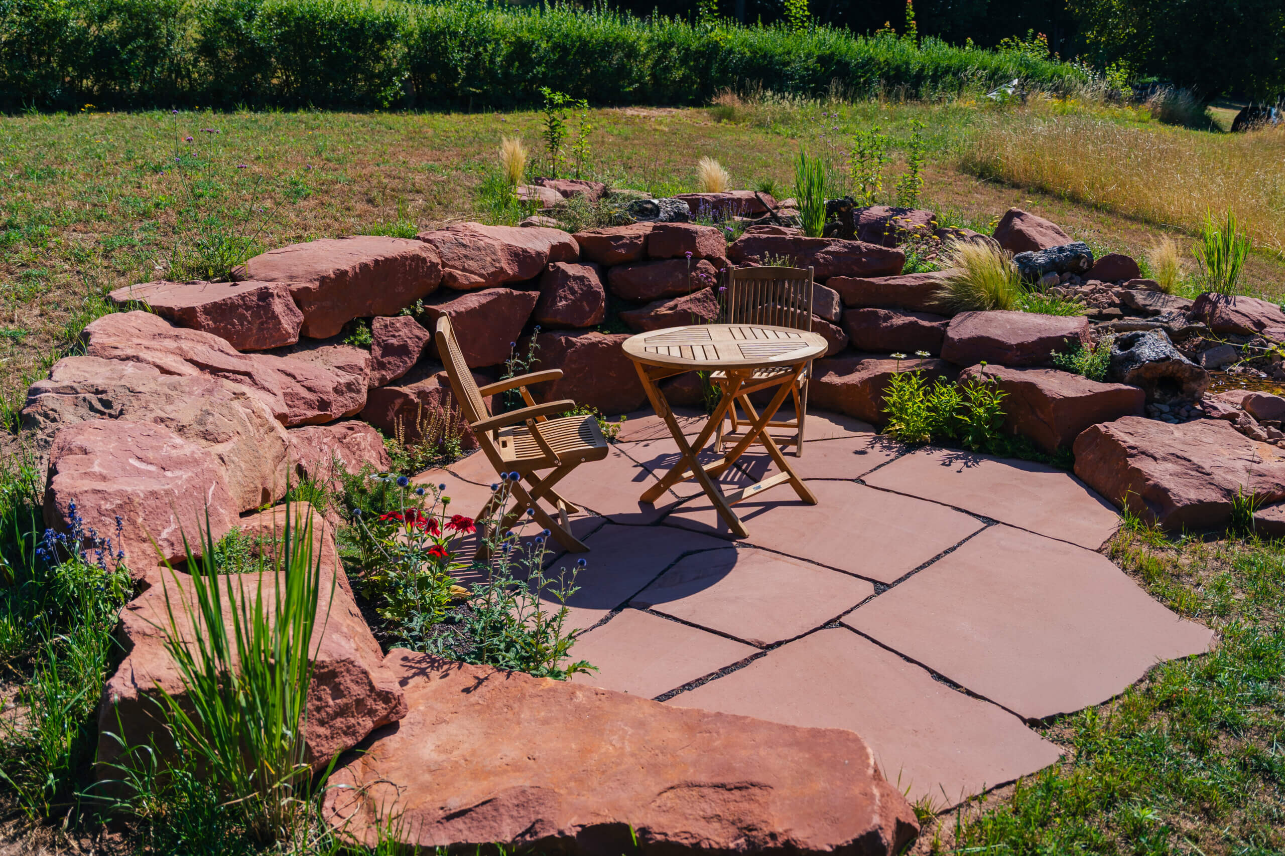 Herausforderung Die Fläche lag in leichter Hanglage und war als Sitzplatz schwer nutzbar. | Lösung Durch gezielte Modellierung des Geländes und maschinelle Vorbereitung entstand eine ebene, sonnige Fläche mit optimalem Anschluss an die Umgebung. |