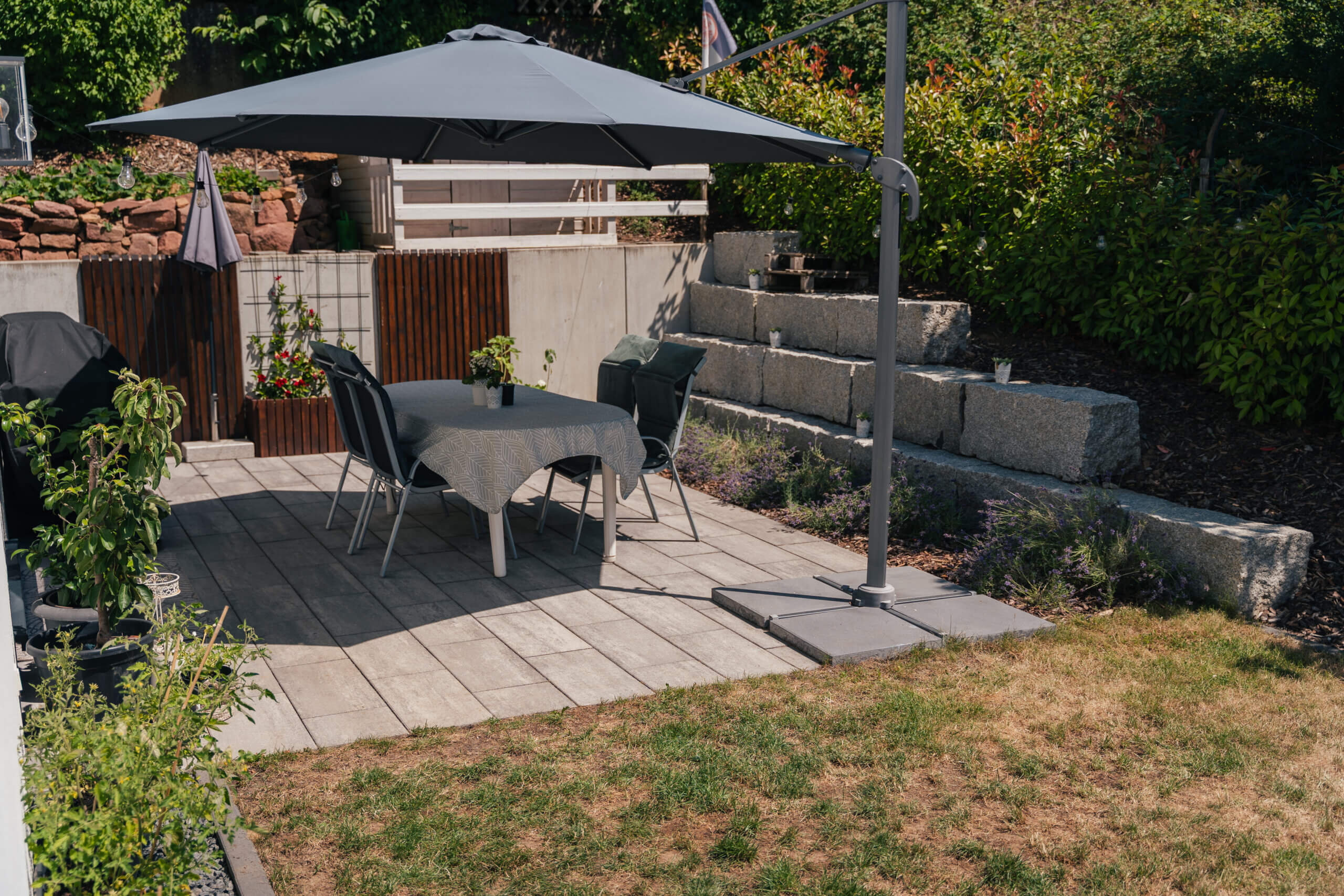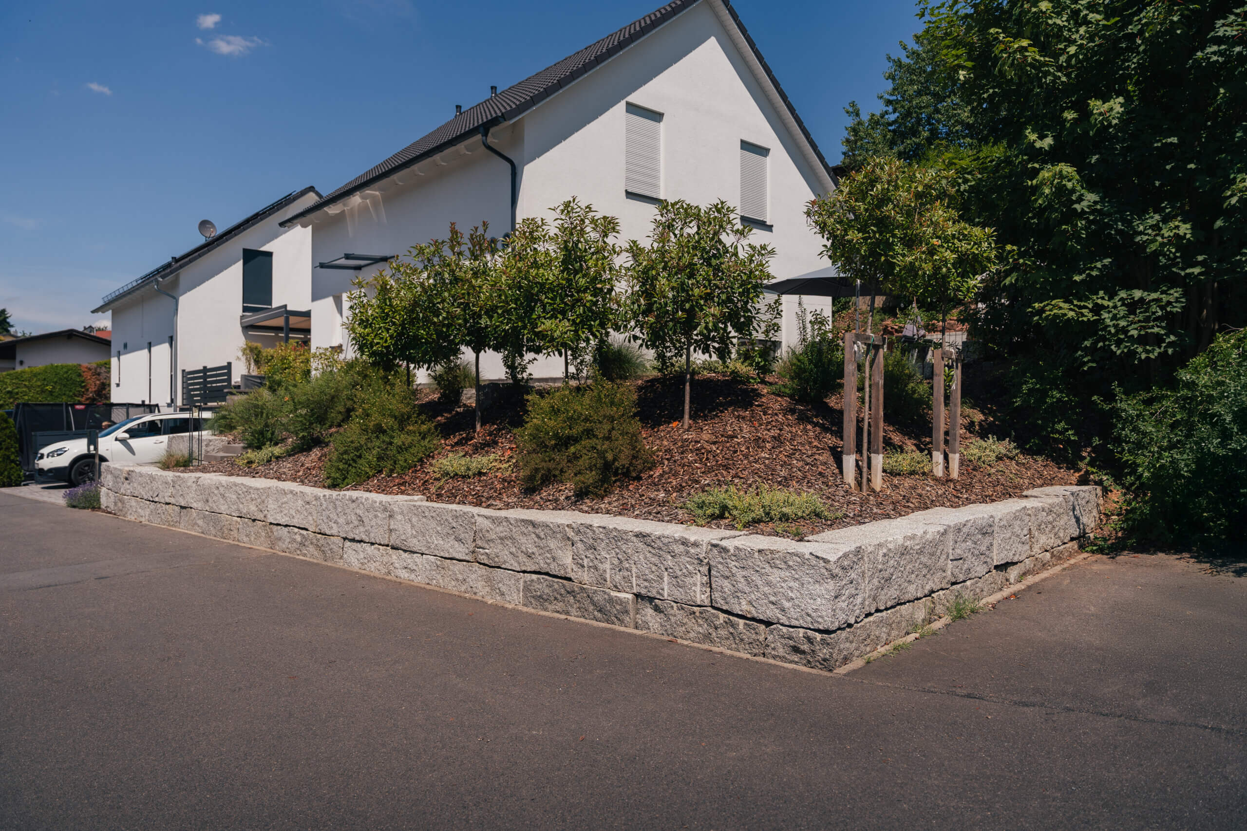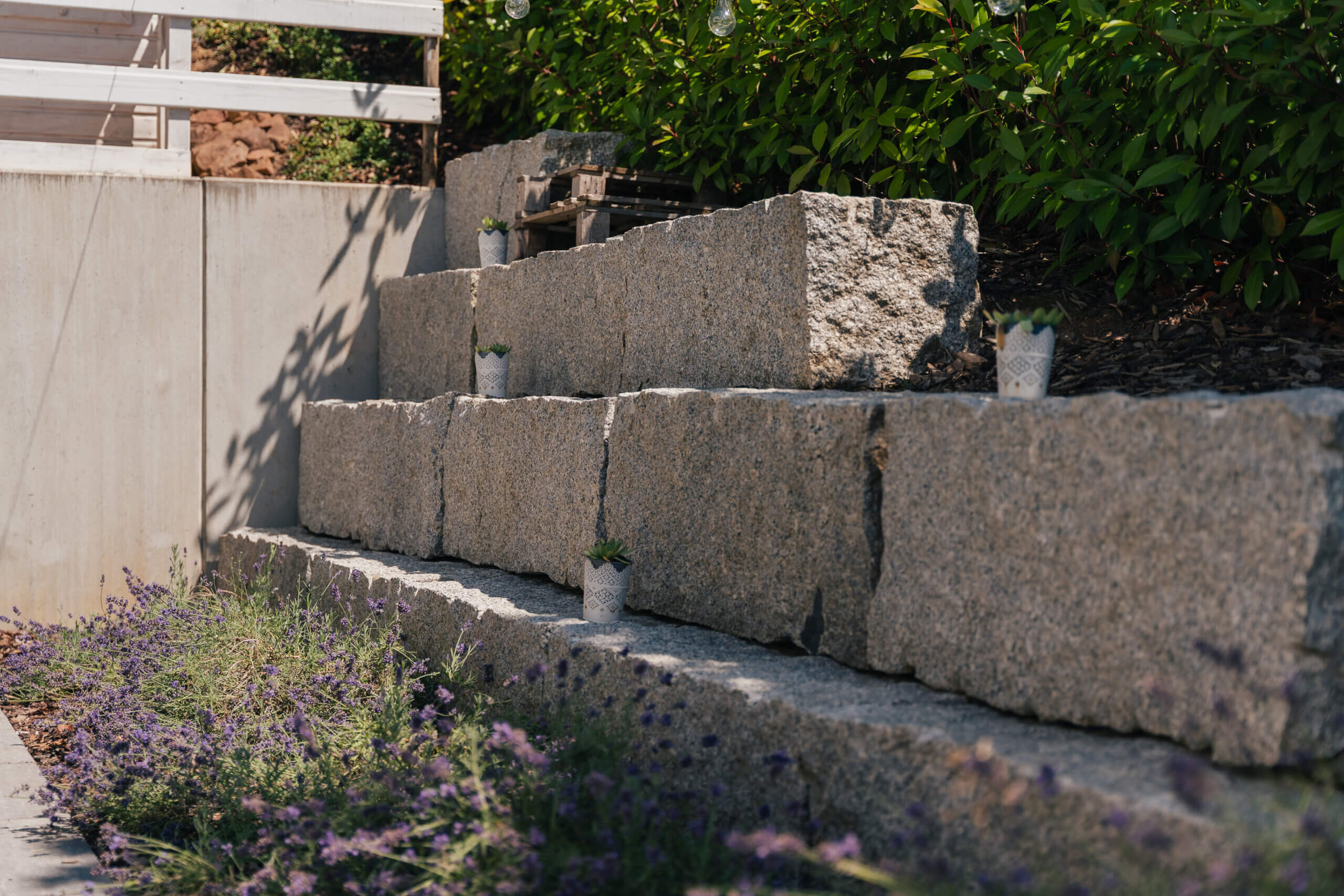 Herausforderung Höhenunterschiede im Garten sollten abgefangen werden, gleichzeitig war eine nutzbare Fläche gewünscht. | Lösung Eine in den Hang eingepasste Granitmauer schafft ebene Bereiche und dient gleichzeitig als integrierte Sitzmöglichkeit - funktional, ästhetisch und platzsparend. |