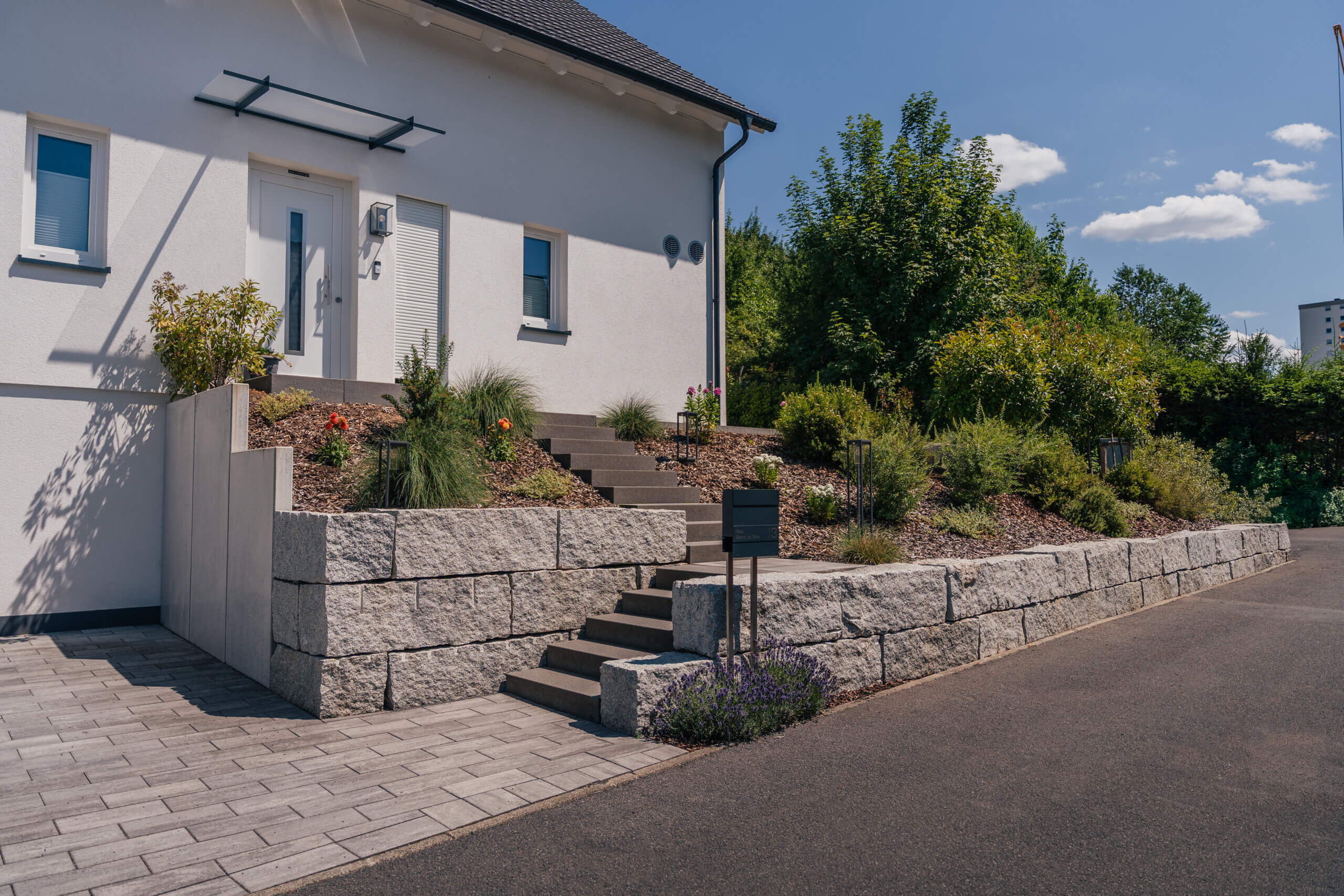 Herausforderung Große Höhendifferenz zwischen Straße und Hauseingang bei begrenztem Platz. | Lösung Planung einer funktionalen Treppenanlage mit Richtungswechseln. L-Steine und eine Natursteinmauer aus Granit fangen die Höhe sicher ab und integrieren sich optisch in die Gestaltung. |